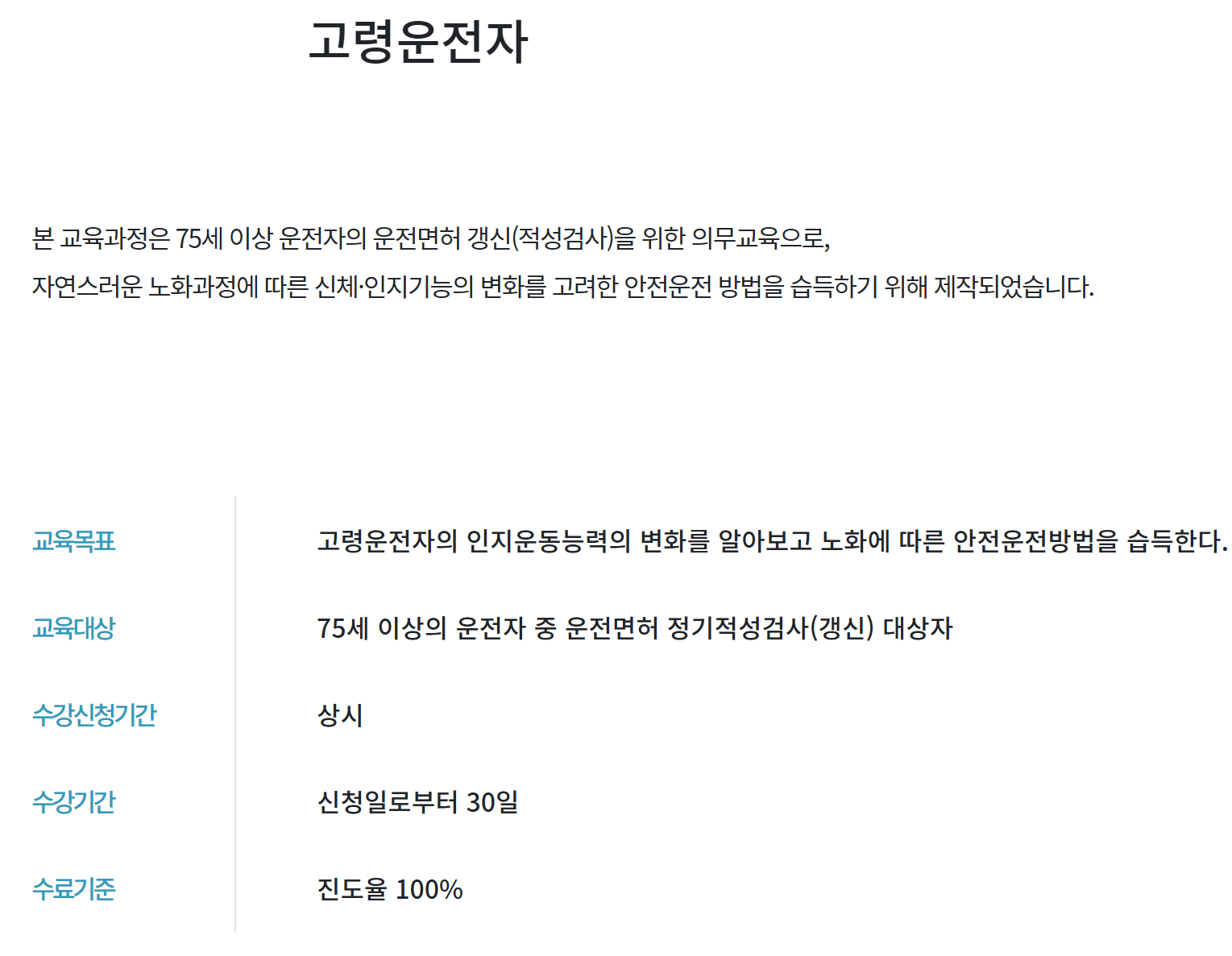 도로교통공단은 고령운전자의 안전한 운전을 돕기 위해 교통안전교육을 제공하고 있습니다. 만 65세 이상 고령운전자에게 교통안전 교육을 권장하며, 만 75세 이상 운전자는 반드시 교육에 참여해야 합니다.