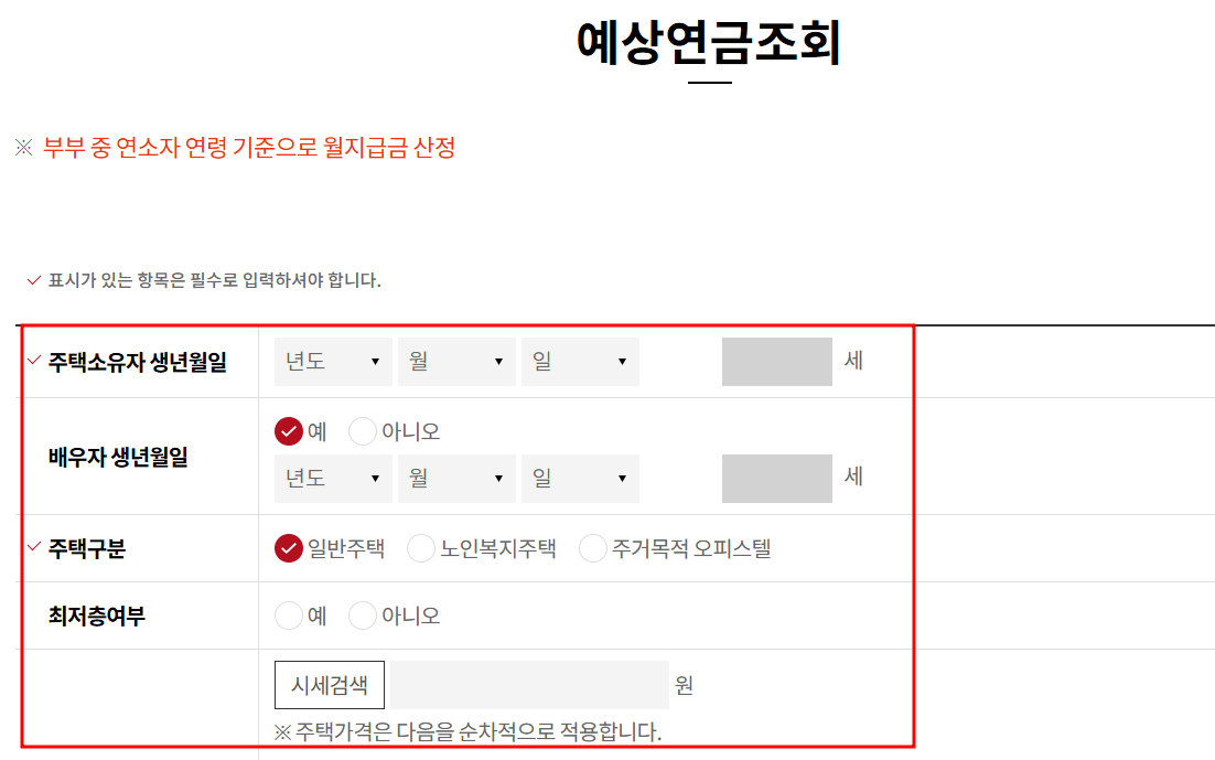 - 주택 가격: 정확한 주택 가격을 기준으로 수령액이 산정되므로, 한국부동산원 등의 공시가격을 입력합니다.