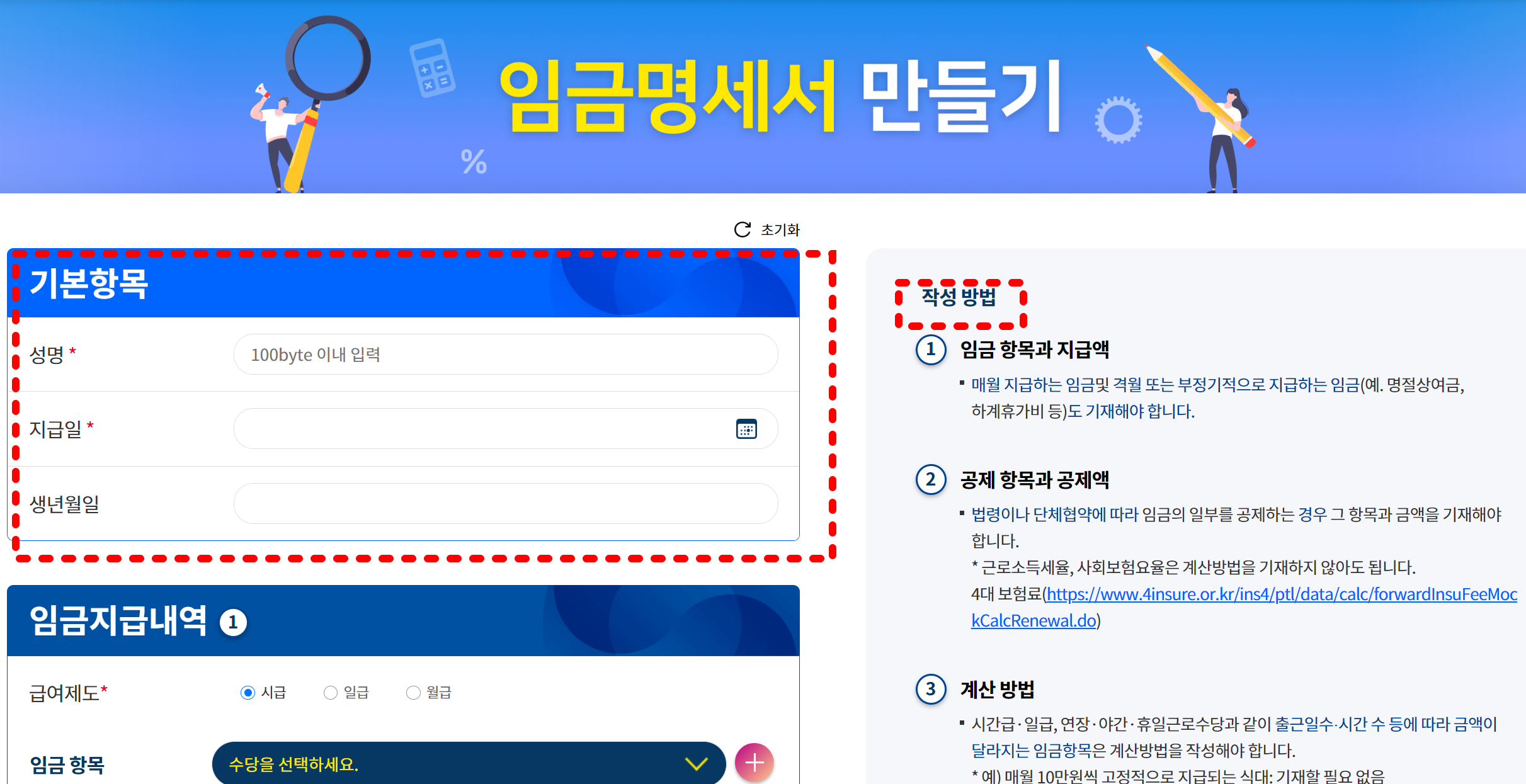 아래처럼 임금명세서 만들기로 넘어가면 기본항목 및 적어야 하는 것들을 적고 만들어보세요.