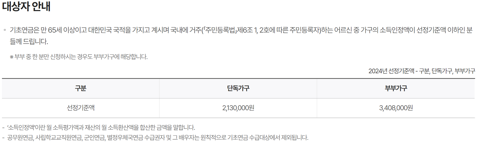 - 월 소득액 단독가구일 경우 2,130,000원 / 부부가구일 경우 3,408,000원 이하