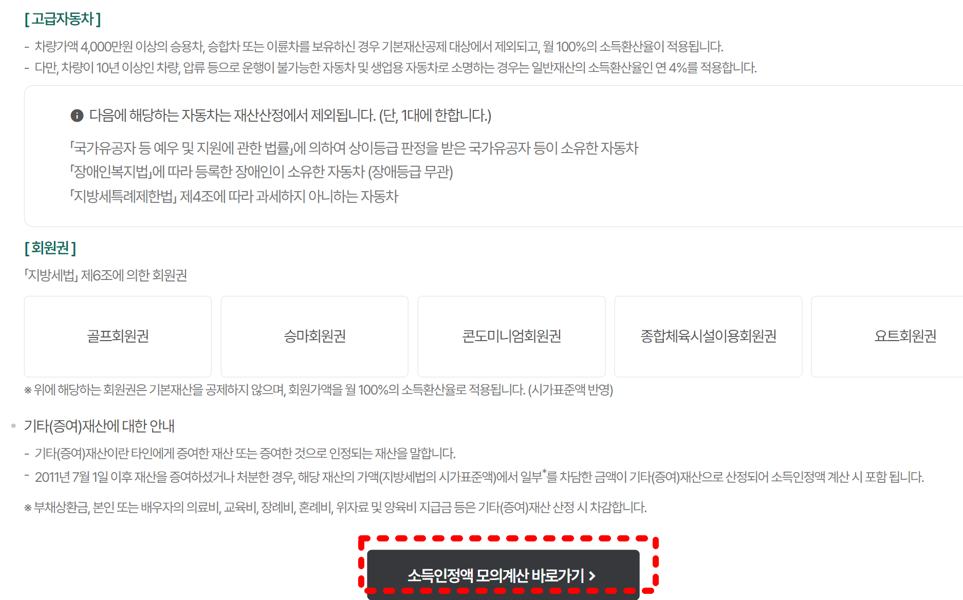 사이트로 이동해 페이지 밑에 보면, 아래처럼 소득인정액 모의계산 바로가기 버튼이 보입니다. 클릭해 모의계산을 해 보세요.