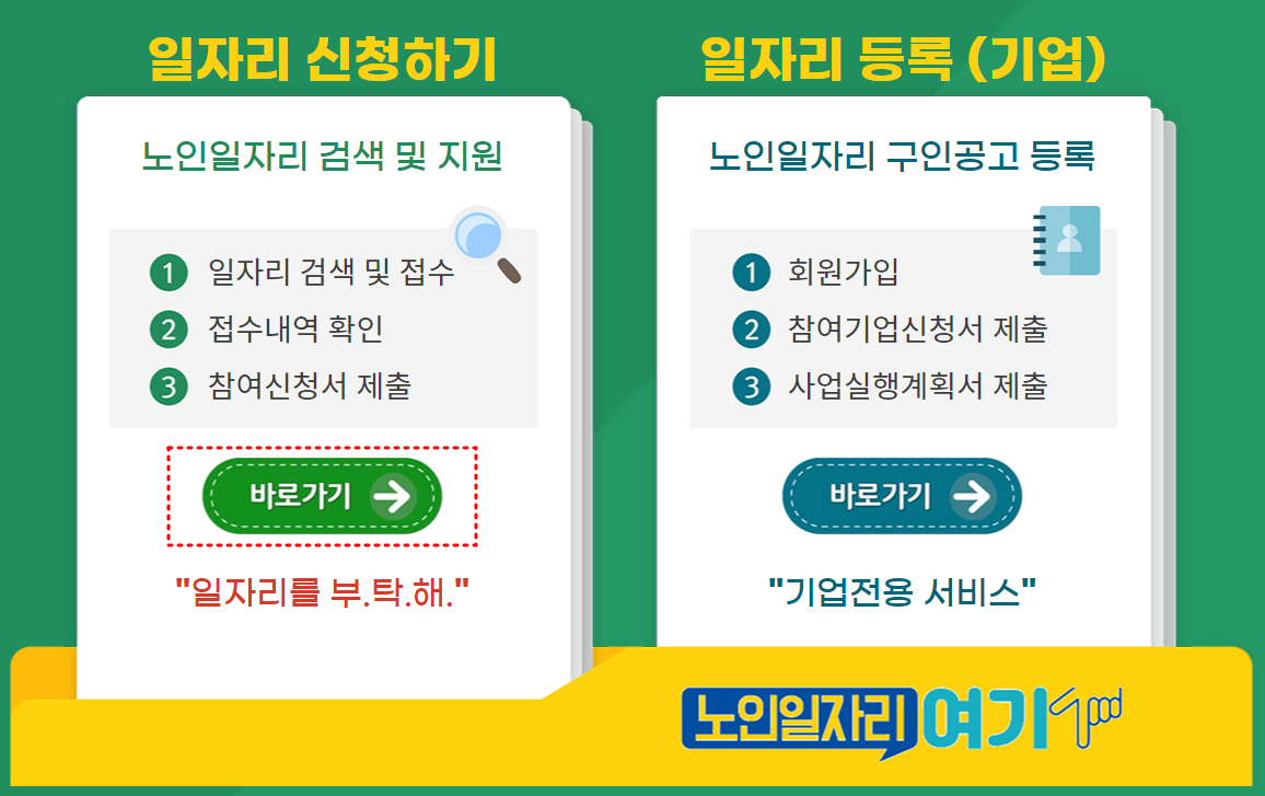 - 노인일자리 여기 홈페이지, 거주지 주민센터 게시판, 또는 뉴스나 언론을 통해 모집 공고를 확인합니다.