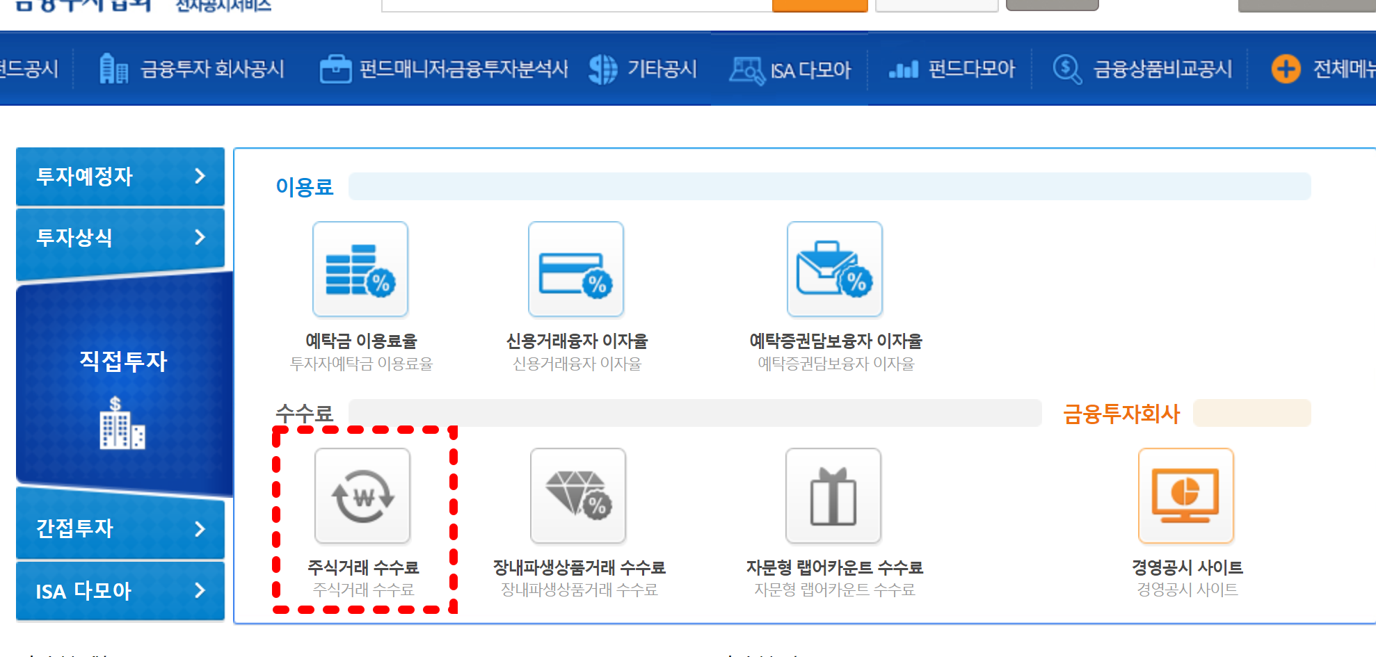 사이트 접속 후 왼쪽 직접투자 탭을 클릭하면 수수료 - 주식거래 수수료부분을 클릭할 수 있습니다.