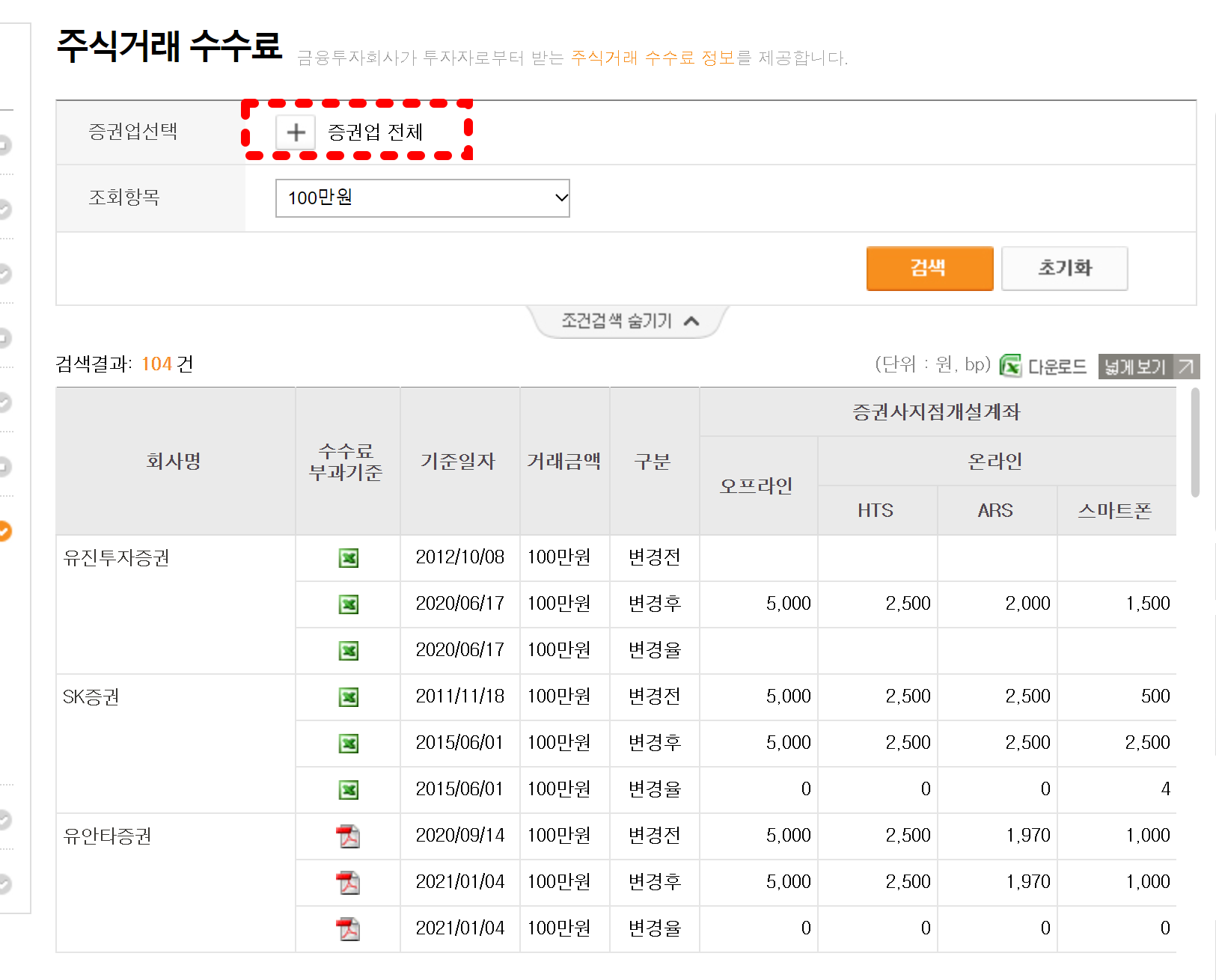 클릭 후 증권업 전체를 클릭하면 현재 증권회사 리스트가 쫙 나오게 됩니다. 여기서 회사명/ 수수료 부과기준/ 기준일자/ 거래금액 등으로 비교가 가능합니다.