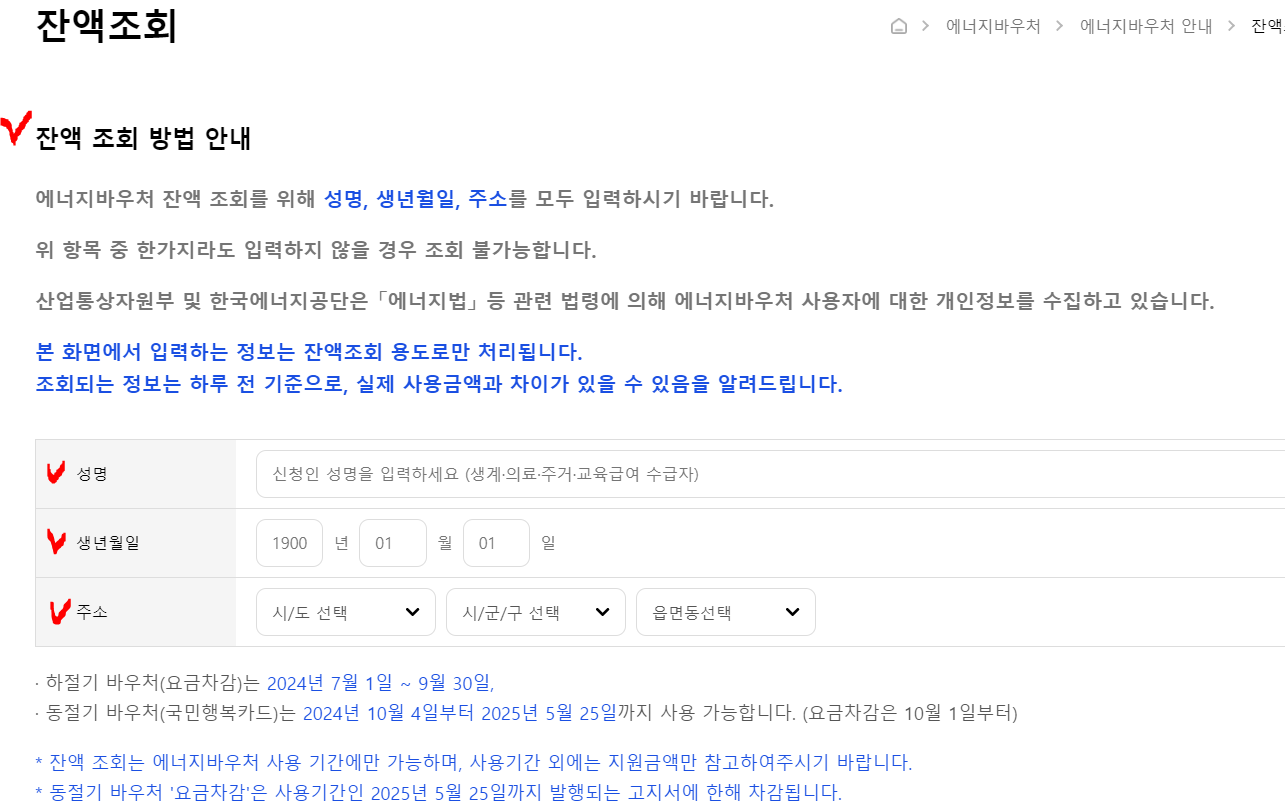 사용 가능한 잔액을 확인하면 보다 계획적으로 에너지 바우처를 사용할 수 있습니다. 홈페이지를 통해 직접 잔액을 확인할 수 있습니다.