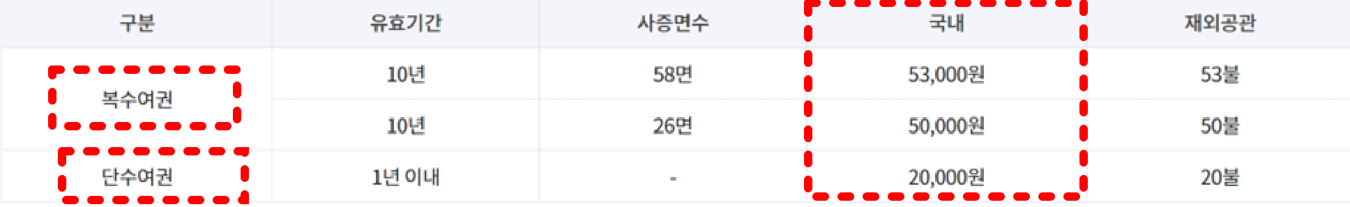 여권을 재발급 하는 경우 수수료가 있습니다. 유효기간과 장수에 따라 가격은 달라집니다.