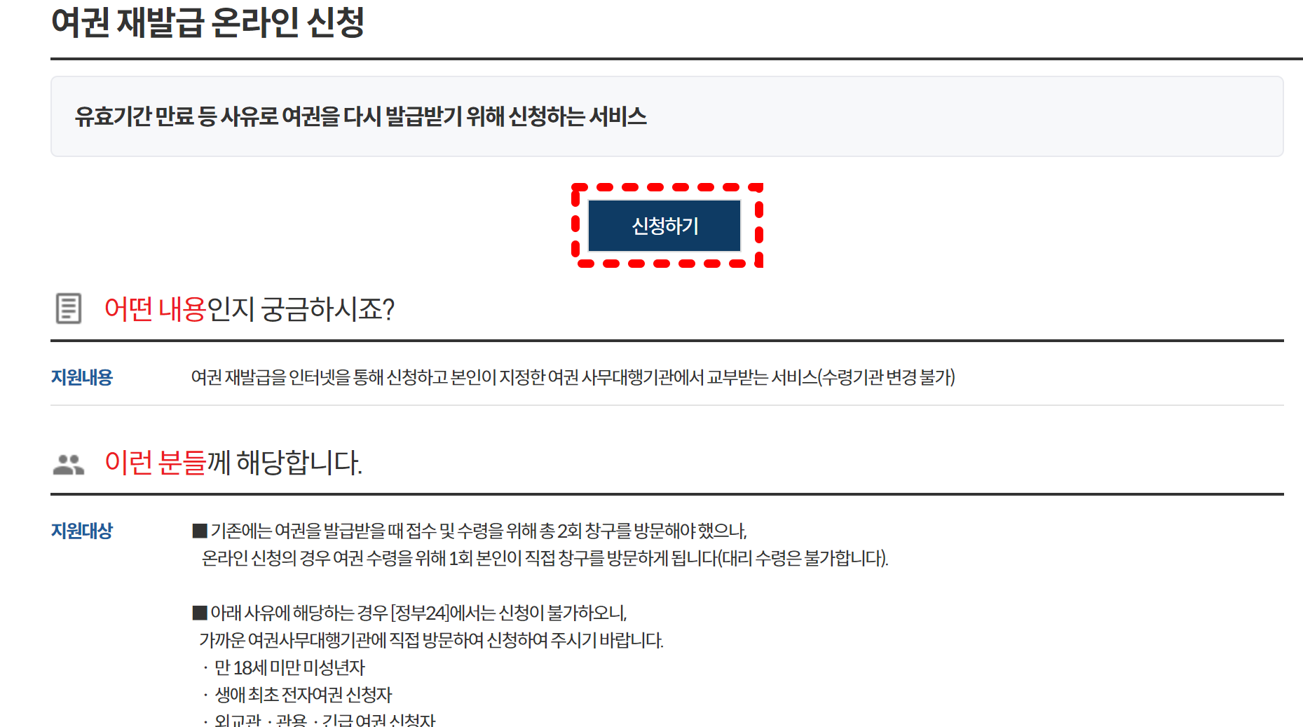 여권은 꼭 본인이 신청해야 합니다. 위사이트를 통해 신청하기 버튼을 누른 후 여권 재신청을 할 수 있습니다.