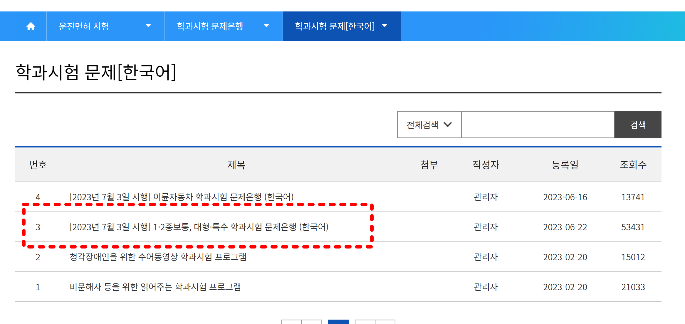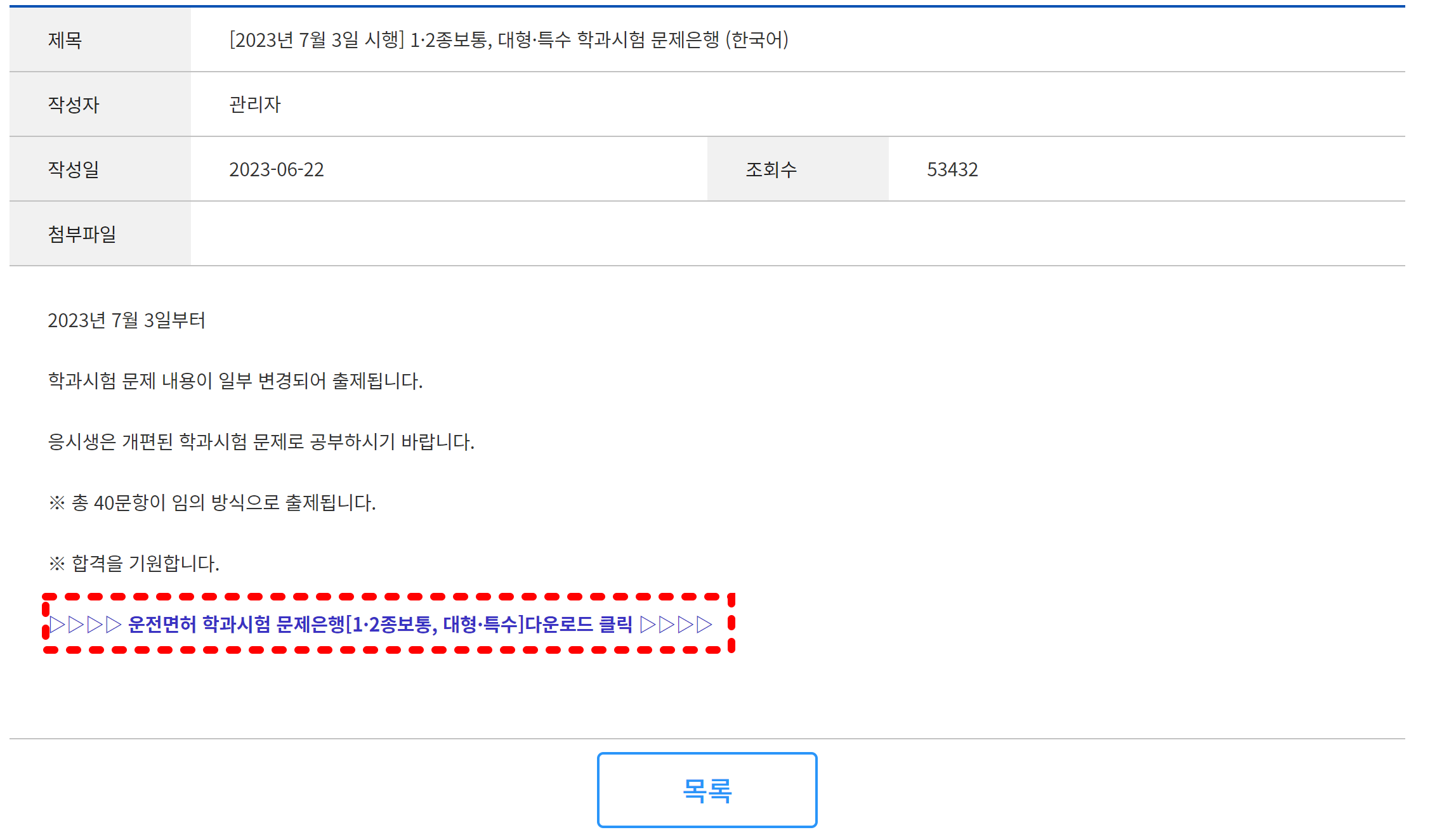 위 버튼을 통해 사이트를 이동하면, 아래와 같이 운전면허 필기시험 문제를 다운받을 수 있는 페이지로 연결됩니다.