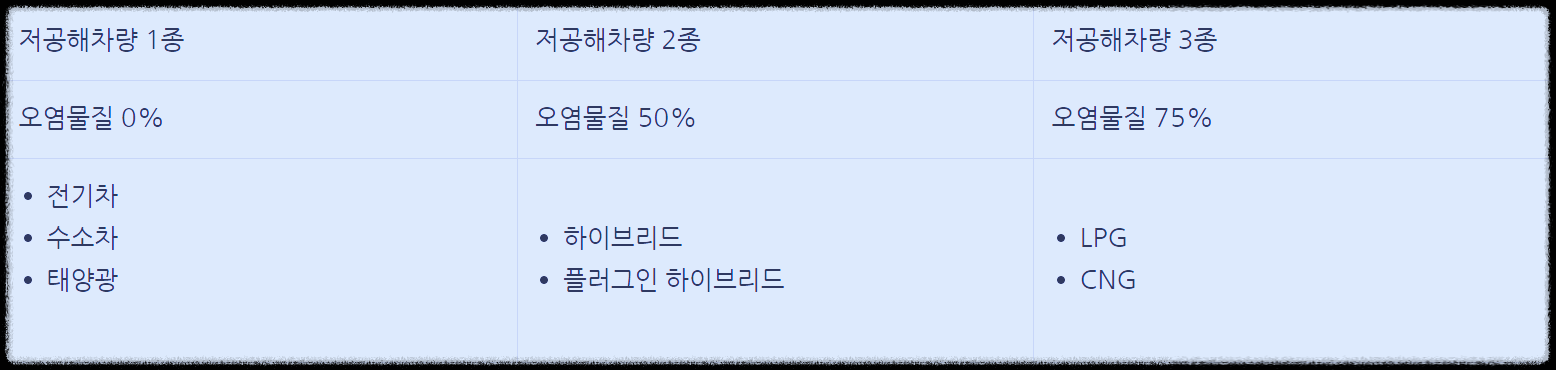 저공해차량인지 확인하려는 분들을 위해 두 가지 종류의 저공해차량이 있으며, 각 차종의 기준에 따라 일산화탄소, 질소산화물, 탄화수소, 입자 상 물질의 측정치가 0g/km 이하인지 확인할 수 있습니다.