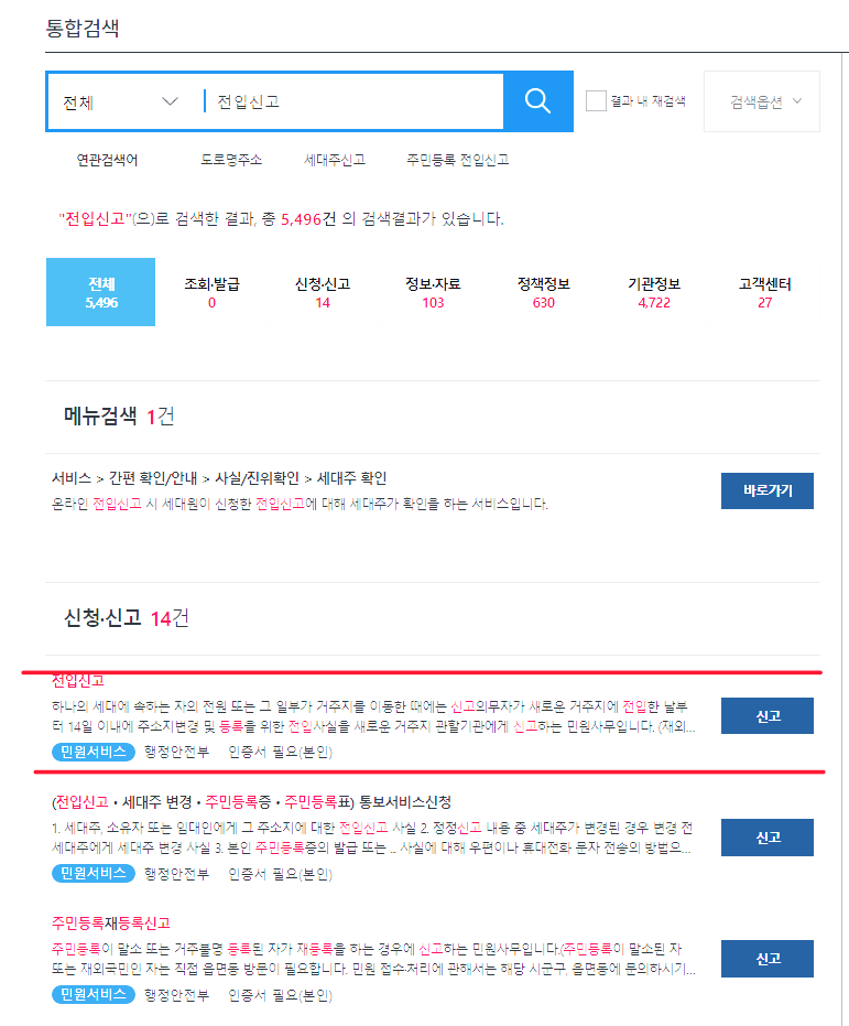 신청, 신고 검색결과에 전입신고가 나오는데 전입신고를 선택합니다.