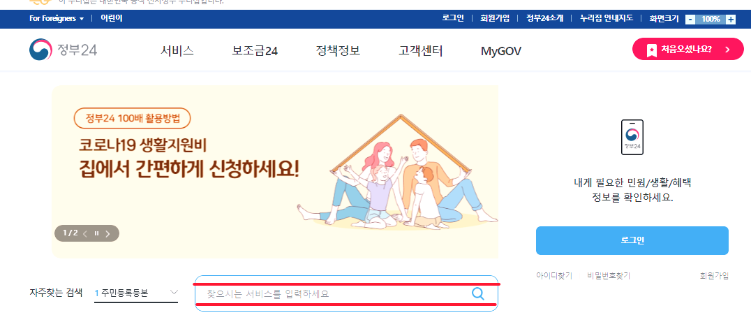 사이트 바로가기를 통해 사이트 접속후 '서비스를 입력하세요'라는 칸에 전입신고를 입력하고 검색합니다.