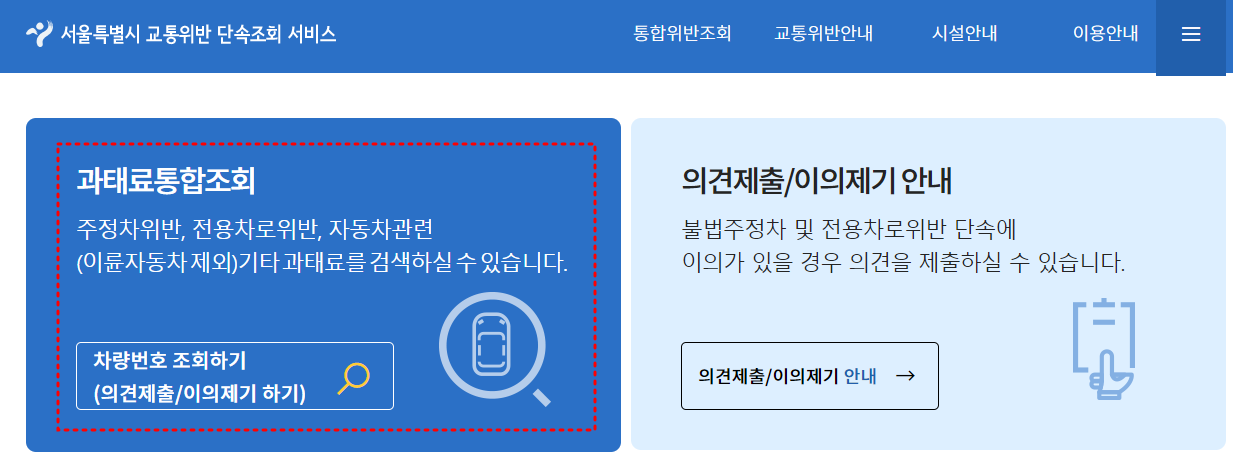 불법 주정차, 전용차로 위반, 과태료 등의 정보들을 확인할 수 있습니다. 서울시 단속조회를 통해 과태료가 발생했는지, 또는 의견제출 및 이의제기를 할 수 있는지를 쉽게 확인할 수 있습니다.
