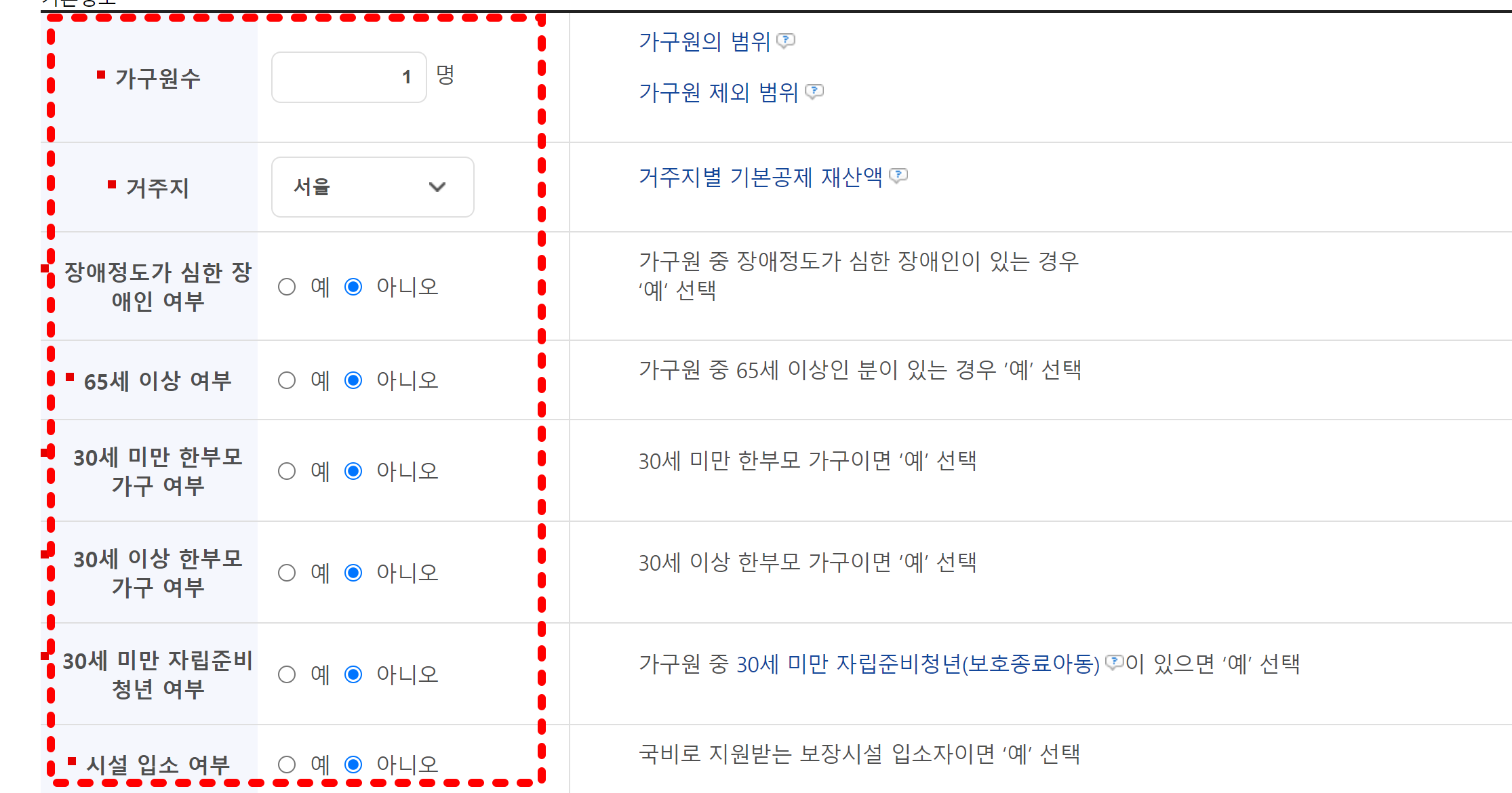 아래와 같이 기본정보를 입력하는 칸에 기본정보를 입력하고, 소득정보 및 재산정보를 입력 후 결과 보기를 클릭해 모의계산을 쉽게 해 볼 수 있습니다.