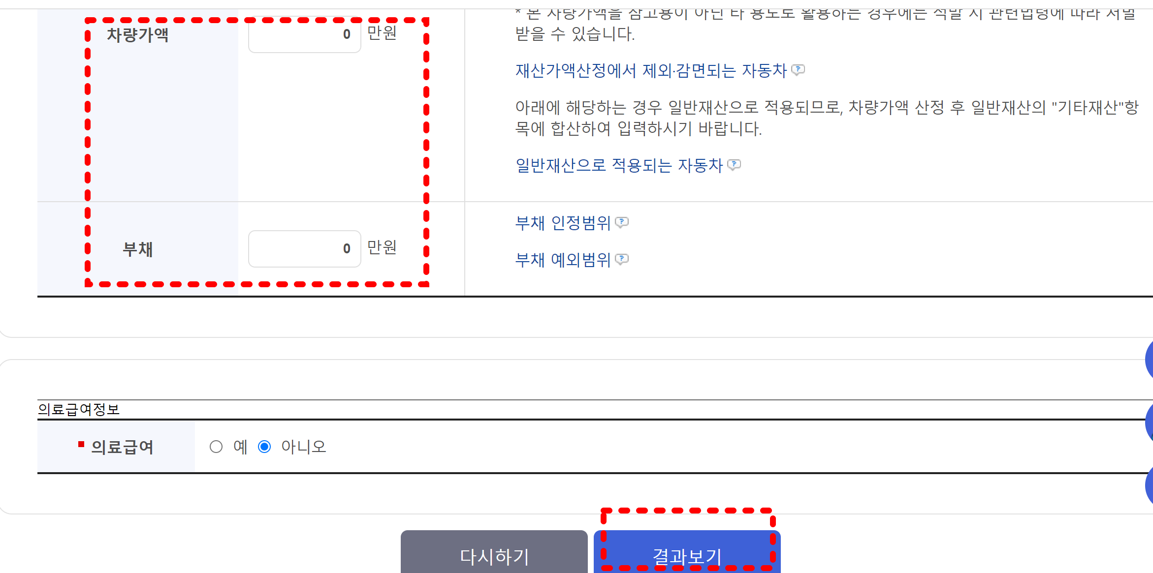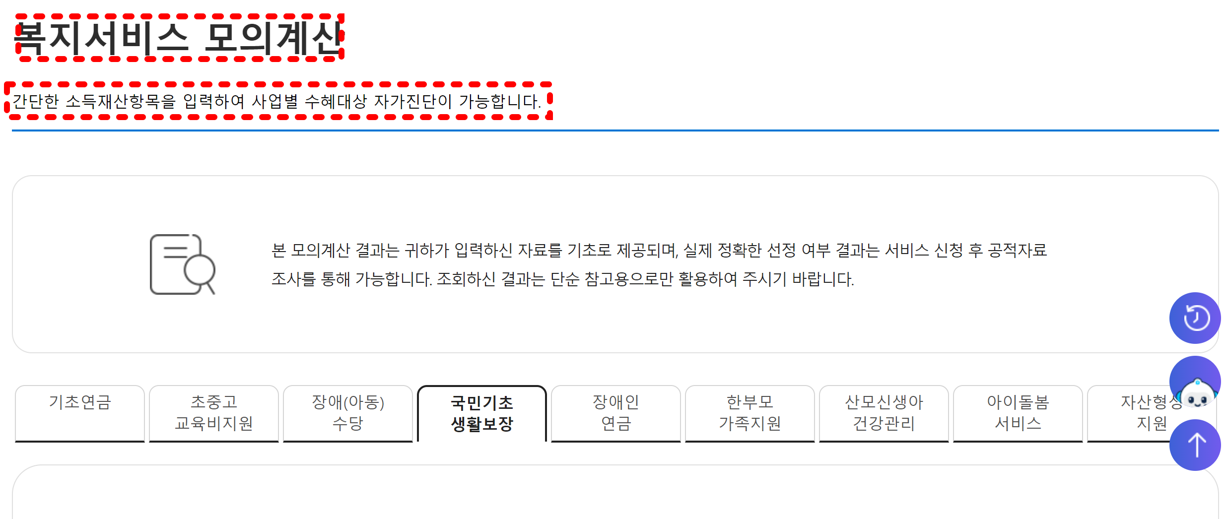 그럼 모의계산을 하는 페이지가 나오는데, 간단한 소득재산항목을 입력해 자가진단을 할 수 있습니다.