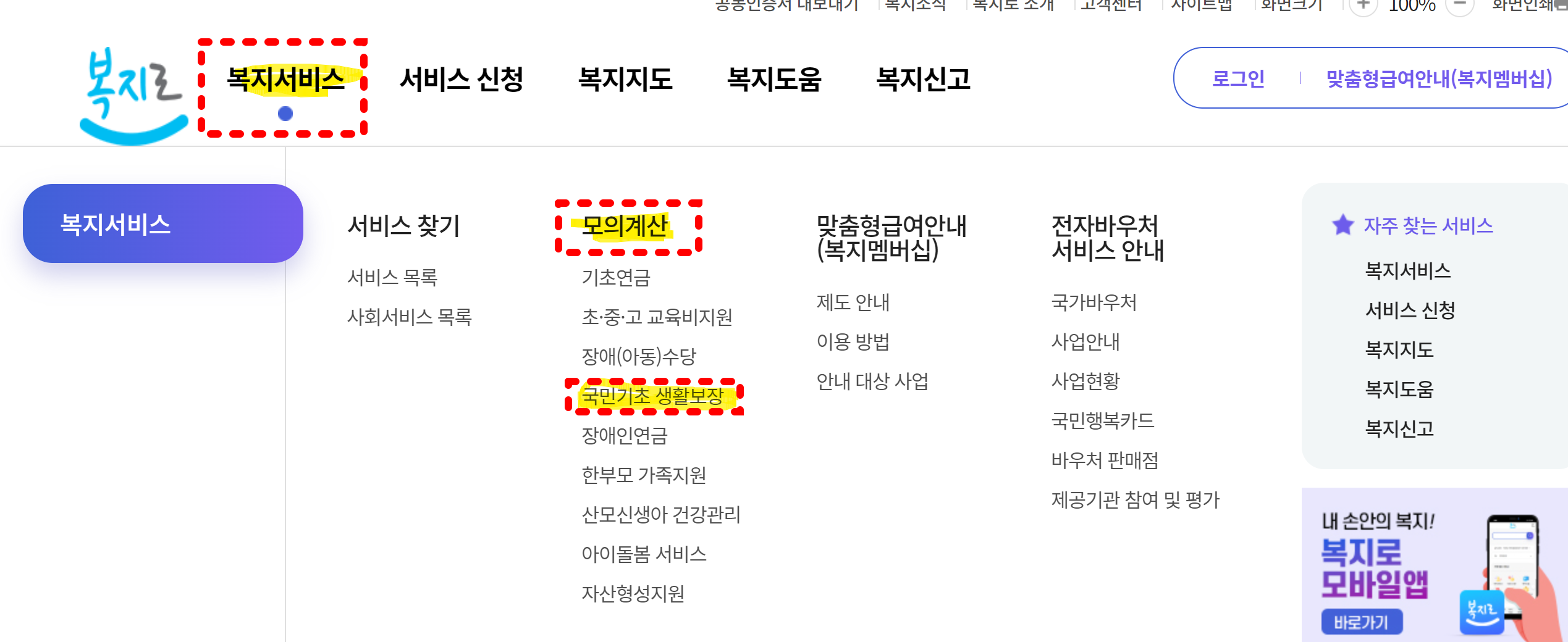 사이트를 접속하면 아래와 같은 화면을 볼 수 있습니다. 여기서 상단의 복지서비스에서 모의계산-> 국민기초생활보장을 클릭합니다.