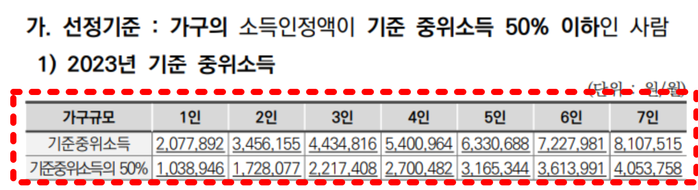 2023년의 기준 중위소득은 아래표를 참고하세요.