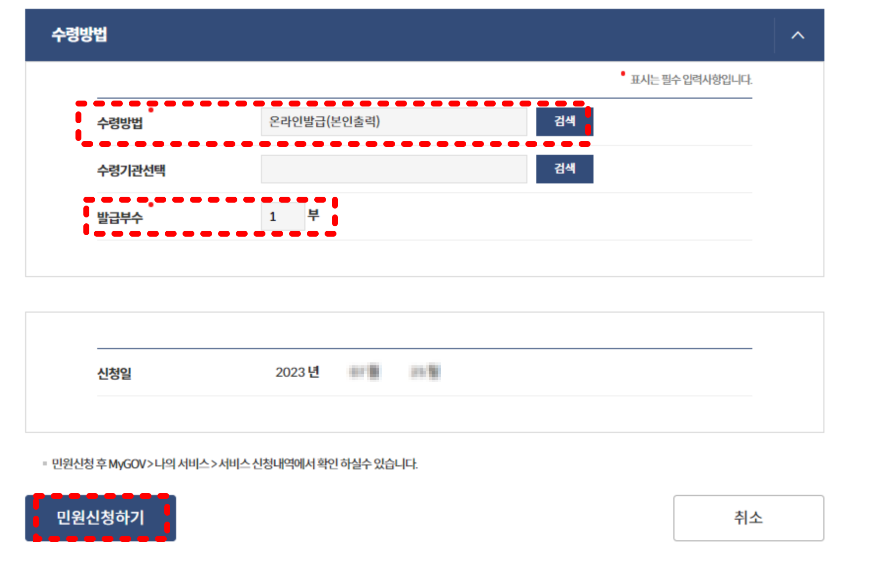 수령방법에 온라인발급(본인출력), 부수 까지 선택 후 민원신청하기를 클릭하면 됩니다.