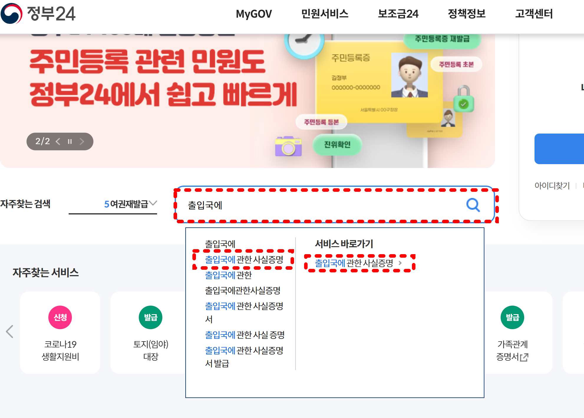 사이트 접속을 하면 아래 화면과 같이 검색하는 창이 나오게 됩니다. 여기에 '출입국에' 까지만 쳐도 출입국에 관한 사실증명 이라는 검색어가 뜨는데 이때 서비스 바로가기의 출입국에 관한 사실증명 을 클릭합니다.