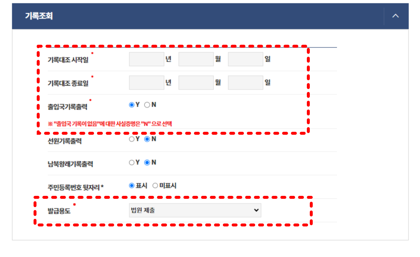 기록조회의 시작일 및 종료일 기록출력 등 빨간 체크박스를 다 채운 후에는