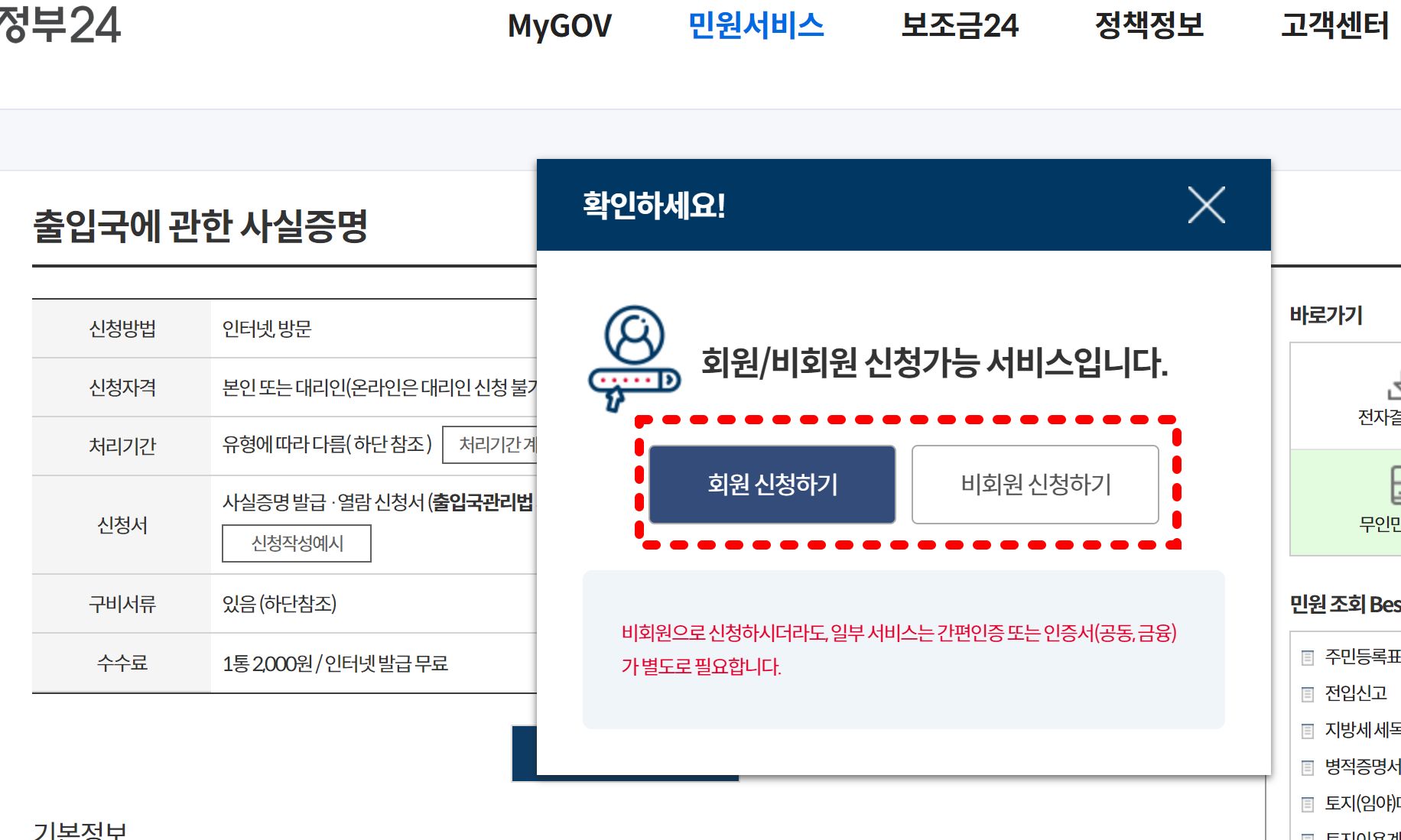 회원 또는 비회원 신청하기 버튼이 나오는데, 여기서 아무거나 클릭해도 해결할 수 있습니다. 보통 비회원 신청하기를 많이 하지만, 정부24에서 여러가지 서류들을 무료로 뽑을 수 있기 때문에 이 기회에 가입하는것도 좋습니다.