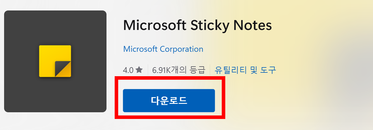 컴퓨터 메모장 다운받기를 통해 사이트로 이동하면 아래처럼 마이크로 소프트에서 무료로 제공하는 스티커 노트를 다운받을 수 있습니다.