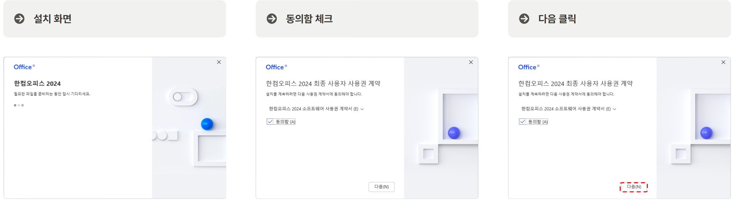파일이 다운로드 되면 실행하기를 눌러 아래와 같은 순서로 컴퓨터에 프로그램을 깔아봅니다.