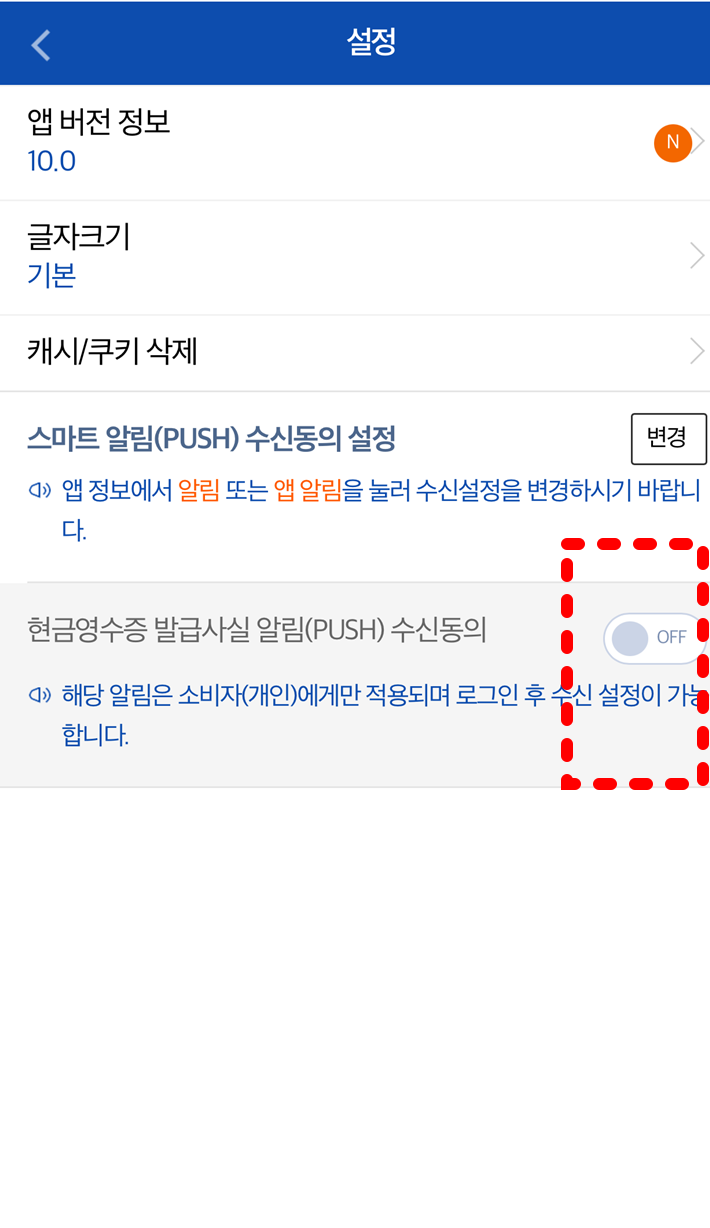 - '현금영수증 발급사실 알림' 항목을 찾아 ON으로 변경합니다.