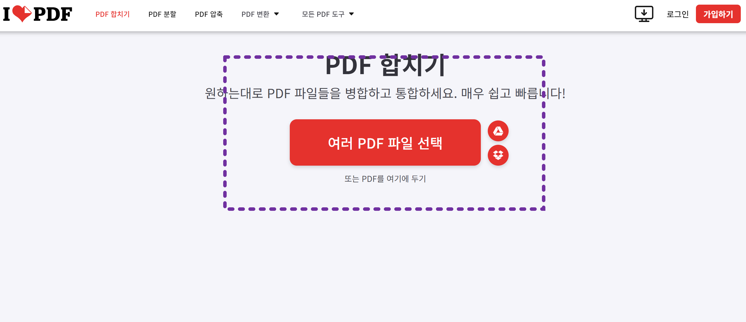 PDF 병합사이트로 추천드리는 사이트는 '아이러브PDF' 라는 사이트 입니다. PDF 병합 사이트를 접속 하면 다음과 같은 화면이 나옵니다. 별도의 가입이 필요없어서 매우 편리하게 사용할 수 있습니다.